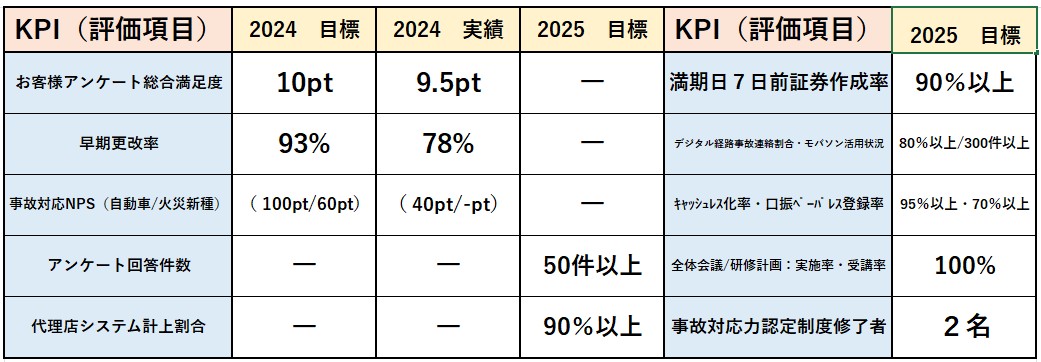 4、お客さまの最善の利益の追求、利益相反の適切な管理、従業員に対する適切な動機づけの枠組み等【原則2・3・7】 役職員全員がお客さまの意向に沿った保険提案やサービスを提供するため、コンプライアンス意識を醸成し、商品・サービス、周辺知識など幅広い観点から知識を習得する教育研修計画や人事評価制度の構築など会社としての仕組みづくりに取り組みます。 ■お客様に不利益が生じないように、コンプライアンス研修を毎月実施確認します。研修の実施記録を残し、欠席者に対しては補講するなど、社員全員の受講を徹底することで社内への浸透を図ります。 ■お客様に不利益が生じないように、商品・法律知識などの習得、損害賠償や事故対応実務のレベルアップを図るため、お客様に寄り添った事故対応に取り組みます。 【KPI】研修計画毎月の実施率/受講率・事故対応力認定制度修了者数
